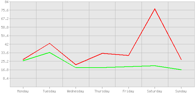 | Понедельник | 27 | 10,38% | 26 | 16,67% | | Вторник | 43 | 16,54% | 34 | 21,79% | | Среда | 22 | 8,46% | 19 | 12,18% | | Четверг | 33 | 12,69% | 19 | 12,18% | | Пятница | 31 | 11,92% | 20 | 12,82% | | Суббота | 77 | 29,62% | 21 | 13,46% | | Воскресенье | 27 | 10,38% | 17 | 10,9% | | Итого | 260 | 146 |