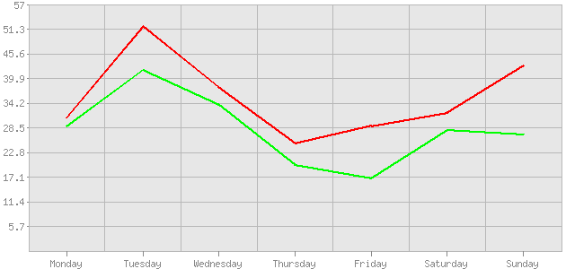 | Понедельник | 31 | 12,4% | 29 | 14,72% | | Вторник | 52 | 20,8% | 42 | 21,32% | | Среда | 38 | 15,2% | 34 | 17,26% | | Четверг | 25 | 10% | 20 | 10,15% | | Пятница | 29 | 11,6% | 17 | 8,63% | | Суббота | 32 | 12,8% | 28 | 14,21% | | Воскресенье | 43 | 17,2% | 27 | 13,71% | | Итого | 250 | 186 |