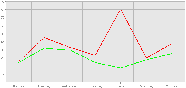 | Понедельник | 23 | 7,82% | 22 | 11,52% | | Вторник | 50 | 17,01% | 38 | 19,9% | | Среда | 39 | 13,27% | 36 | 18,85% | | Четверг | 30 | 10,2% | 22 | 11,52% | | Пятница | 82 | 27,89% | 16 | 8,38% | | Суббота | 27 | 9,18% | 25 | 13,09% | | Воскресенье | 43 | 14,63% | 32 | 16,75% | | Итого | 294 | 178 |