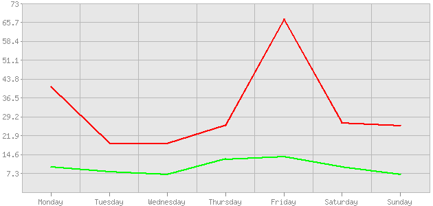 Понедельник | 41 | 18,22% | 10 | 14,49% | Вторник | 19 | 8,44% | 8 | 11,59% | Среда | 19 | 8,44% | 7 | 10,14% | Четверг | 26 | 11,56% | 13 | 18,84% | Пятница | 67 | 29,78% | 14 | 20,29% | Суббота | 27 | 12% | 10 | 14,49% | Воскресенье | 26 | 11,56% | 7 | 10,14% | Итого | 225 | 40 |
