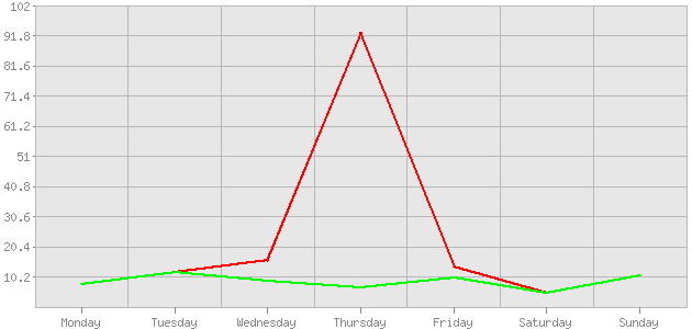 | Понедельник | 8 | 5,03% | 8 | 12,9% | | Вторник | 12 | 7,55% | 12 | 19,35% | | Среда | 16 | 10,06% | 9 | 14,52% | | Четверг | 93 | 58,49% | 7 | 11,29% | | Пятница | 14 | 8,81% | 10 | 16,13% | | Суббота | 5 | 3,14% | 5 | 8,06% | | Воскресенье | 11 | 6,92% | 11 | 17,74% | | Итого | 159 | 60 |