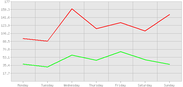 | Понедельник | 95 | 11,15% | 38 | 11,62% | | Вторник | 89 | 10,45% | 32 | 9,79% | | Среда | 161 | 18,9% | 58 | 17,74% | | Четверг | 117 | 13,73% | 47 | 14,37% | | Пятница | 130 | 15,26% | 66 | 20,18% | | Суббота | 112 | 13,15% | 48 | 14,68% | | Воскресенье | 148 | 17,37% | 38 | 11,62% | | Итого | 852 | 212 |